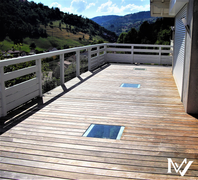 Balcon bois – Terrasse sur pilotis – Terrasse bois – Plancher bois – Plancher mélèze – Plancher bois exotique rouge – Main courante bois – Garde-corps verre – Garde-corps bois - Main courante inox – Escalier extérieur bois – Passerelle bois